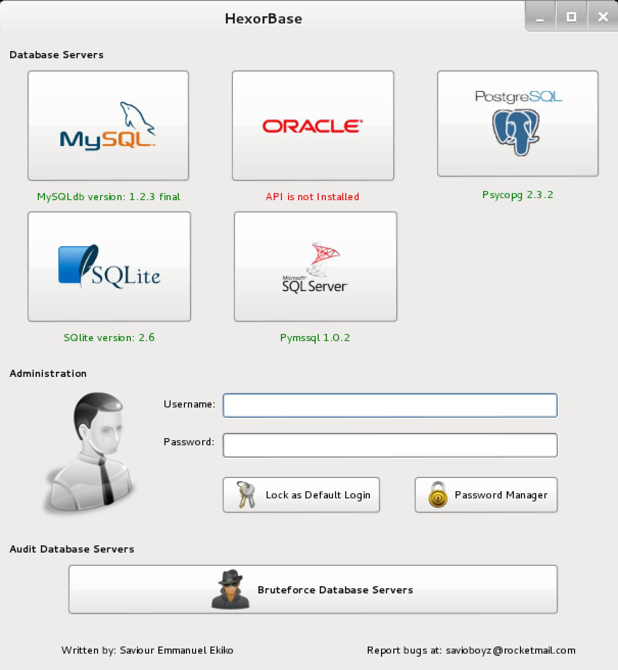 HexorBase是一个数据库应用程序,设计用于从集中位置同时管理和审核多个数据库服务器,它能够执行SQL查询和对常见的数据库服务器(MySQL和SQLite的,则Microsoft SQL服务器,Oracle,PostgreSQL的)暴力破解攻击。 HexorBase允许通过代理甚至Metasploit的旋转滑稽动作与被隐藏在本地子网无法访问远程服务器进行通信的数据包的路由。